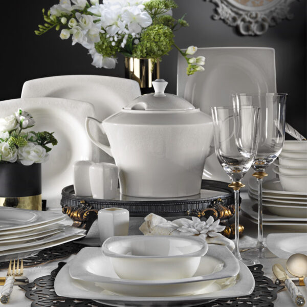 طقم أواني سفرة الطعام بورسلان عالي الجودة 62 قطعة لجميع المناسبات مع تصميم حديث وراقي:
