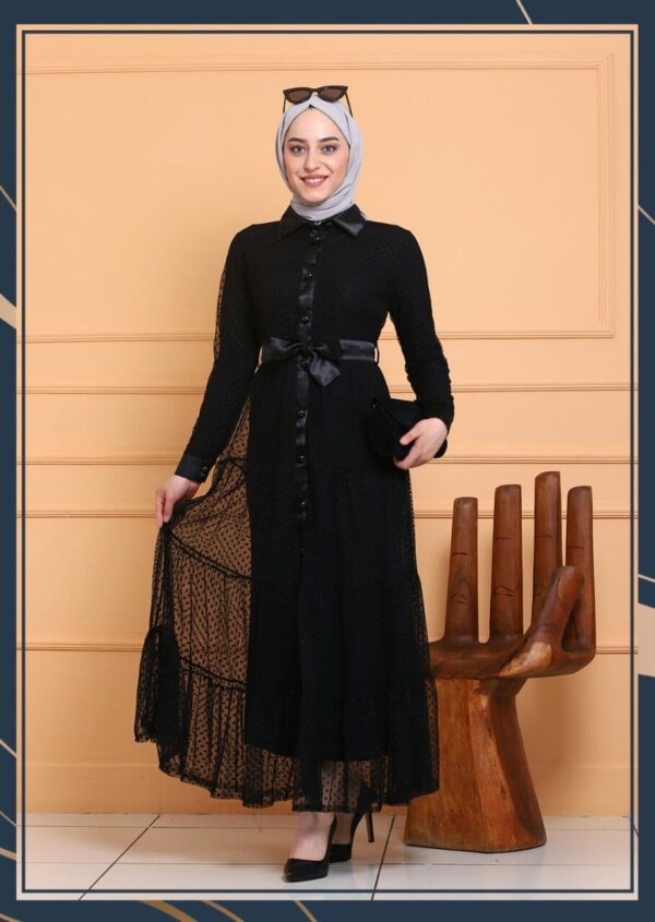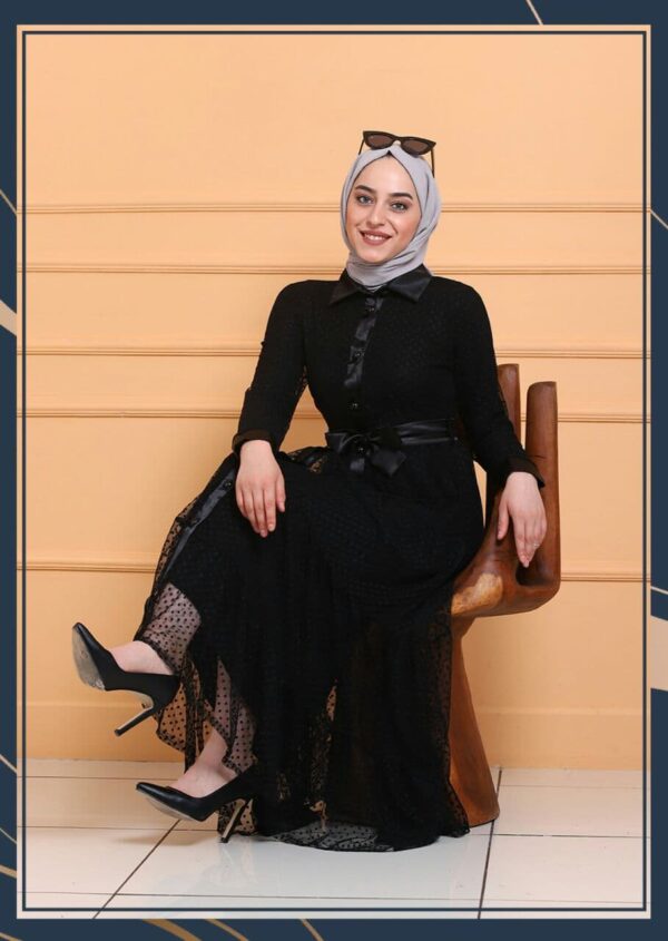 فستان نسائي أسود مع أزرار بتصميم رائع وجذاب / صناعة تركية – بيع بالجملة
